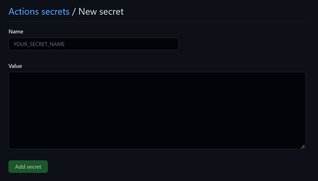 Name에 GITHUB_TOKEN을 입력하고 Value에 아까 받은 토큰 값을 입력하고 secret을 추가한다.