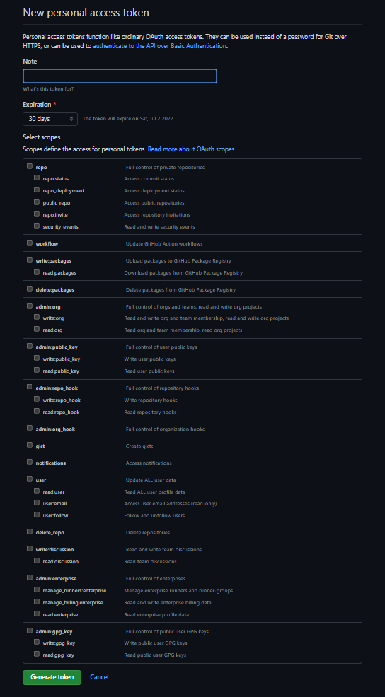 - 토큰의 이름을 설정하고 권한을 부여할 것들을 체크해준 뒤 토큰을 생성한다.