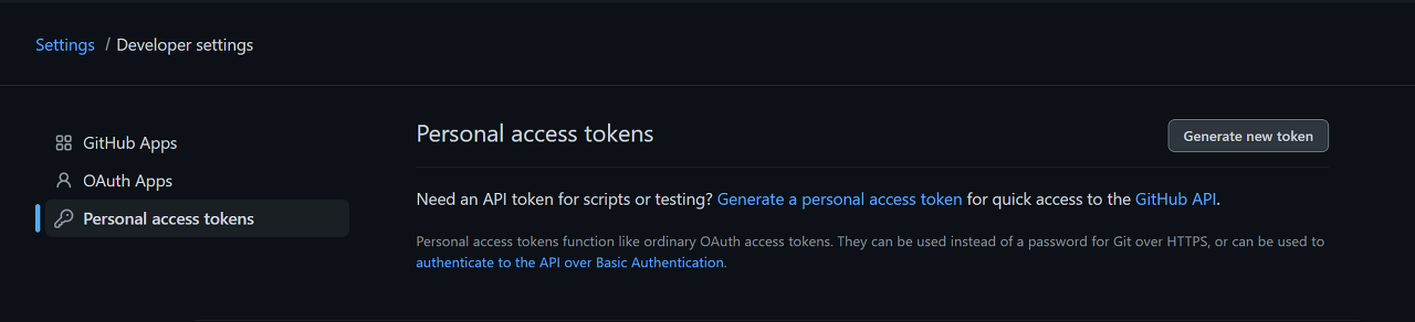 Personal access tokens에 들어가 Generate new token을 클릭한다.