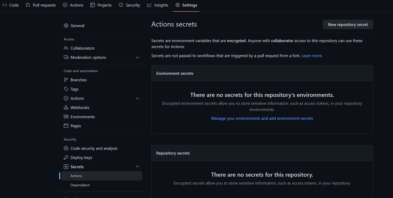 Repository로 돌아와서 Settings > Secrets > Actions 에서 New repository secret을 클릭한다.