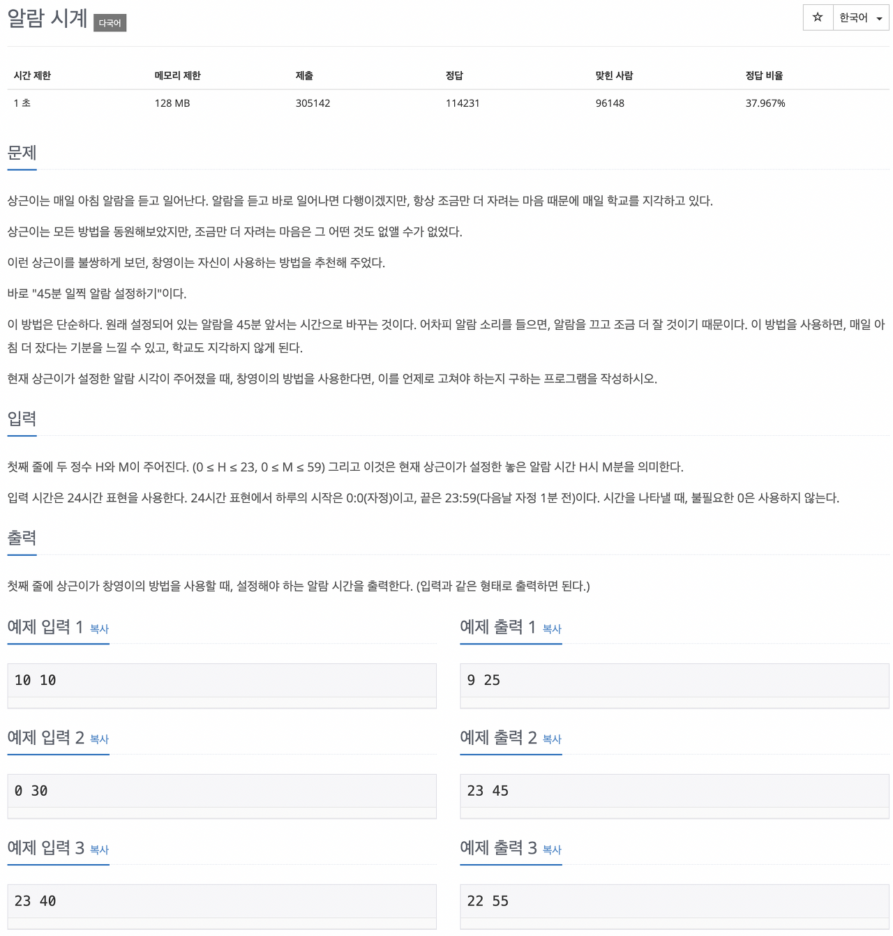 두 수를 입력 받아 시간과 분으로 나누고 -45분 한 결과값을 반환하는 문제였다.