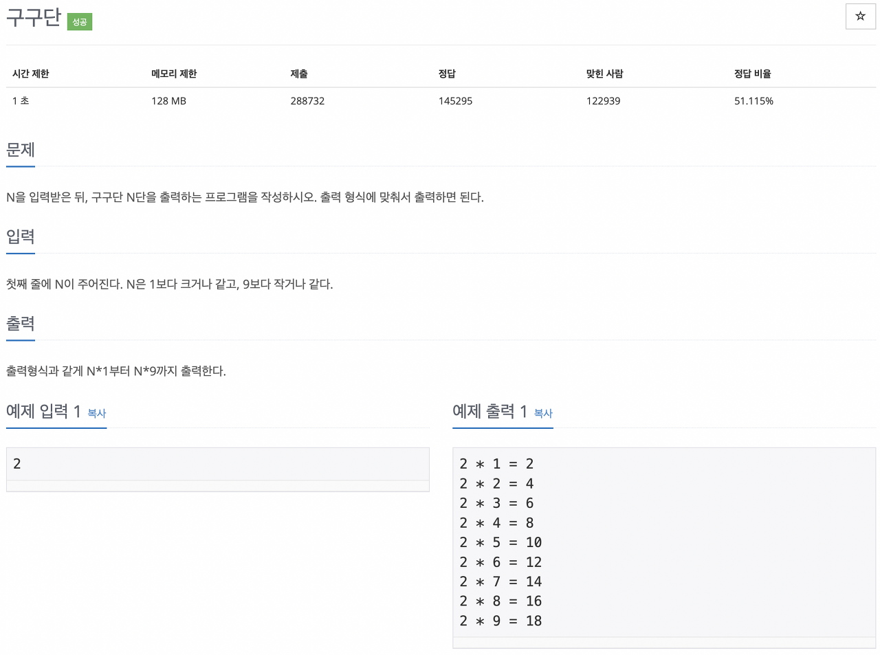 반복문을 처음 배우면 필수 예제로 풀어보는 간단한 구구단 문제였다.