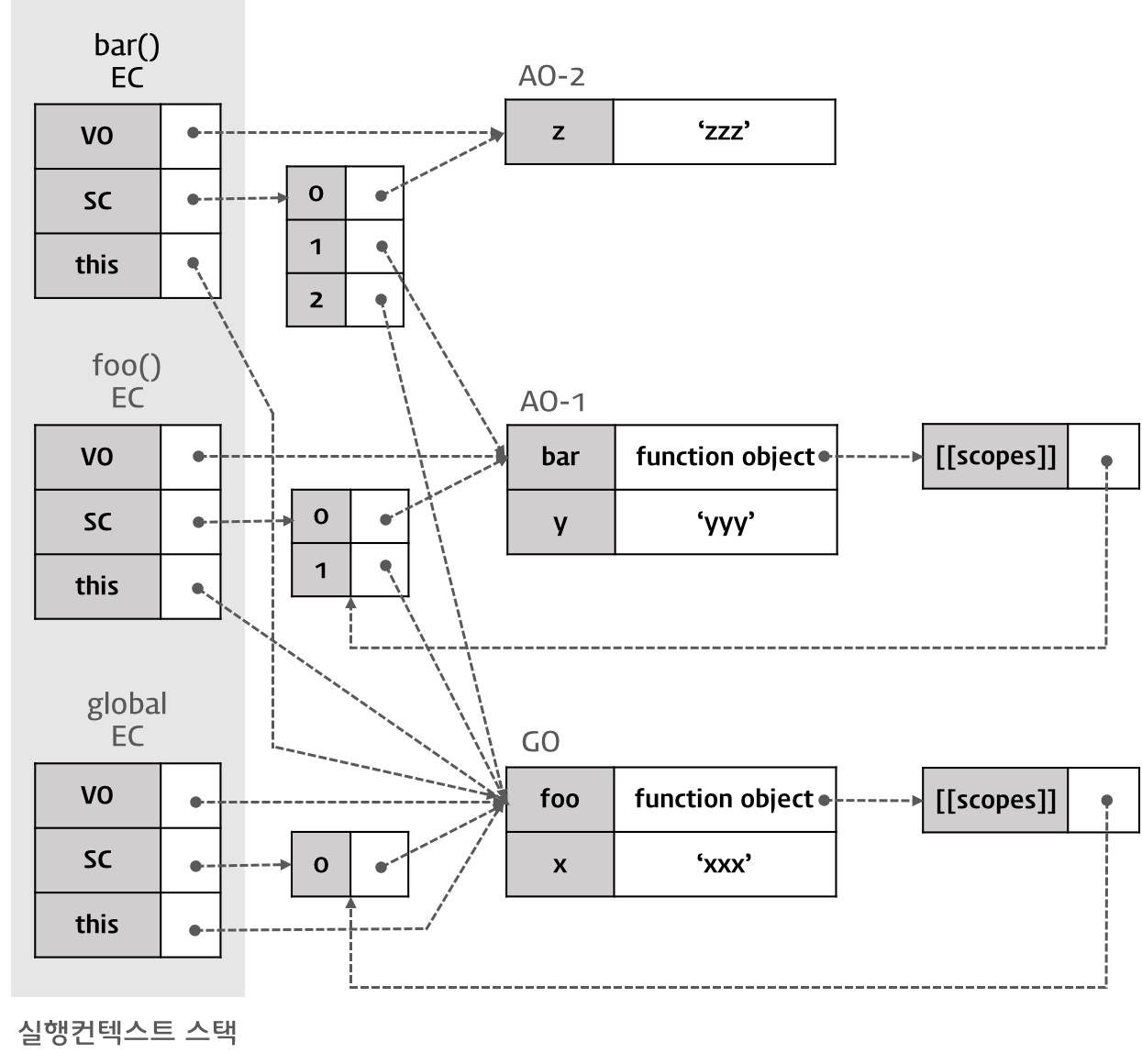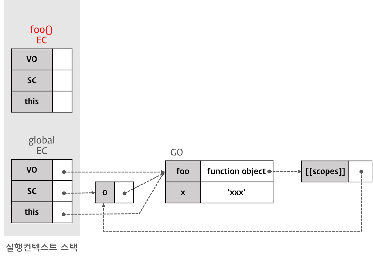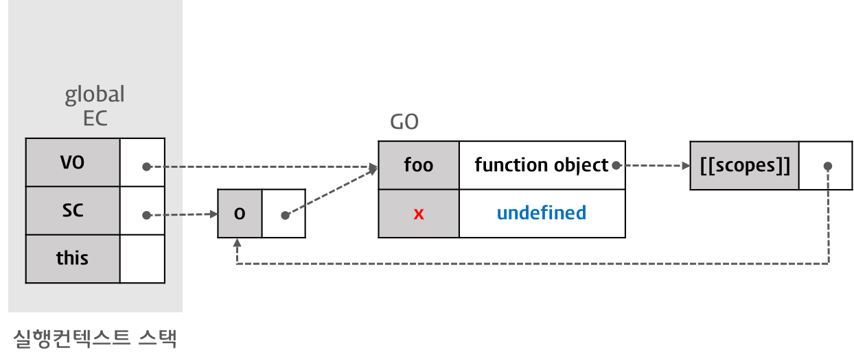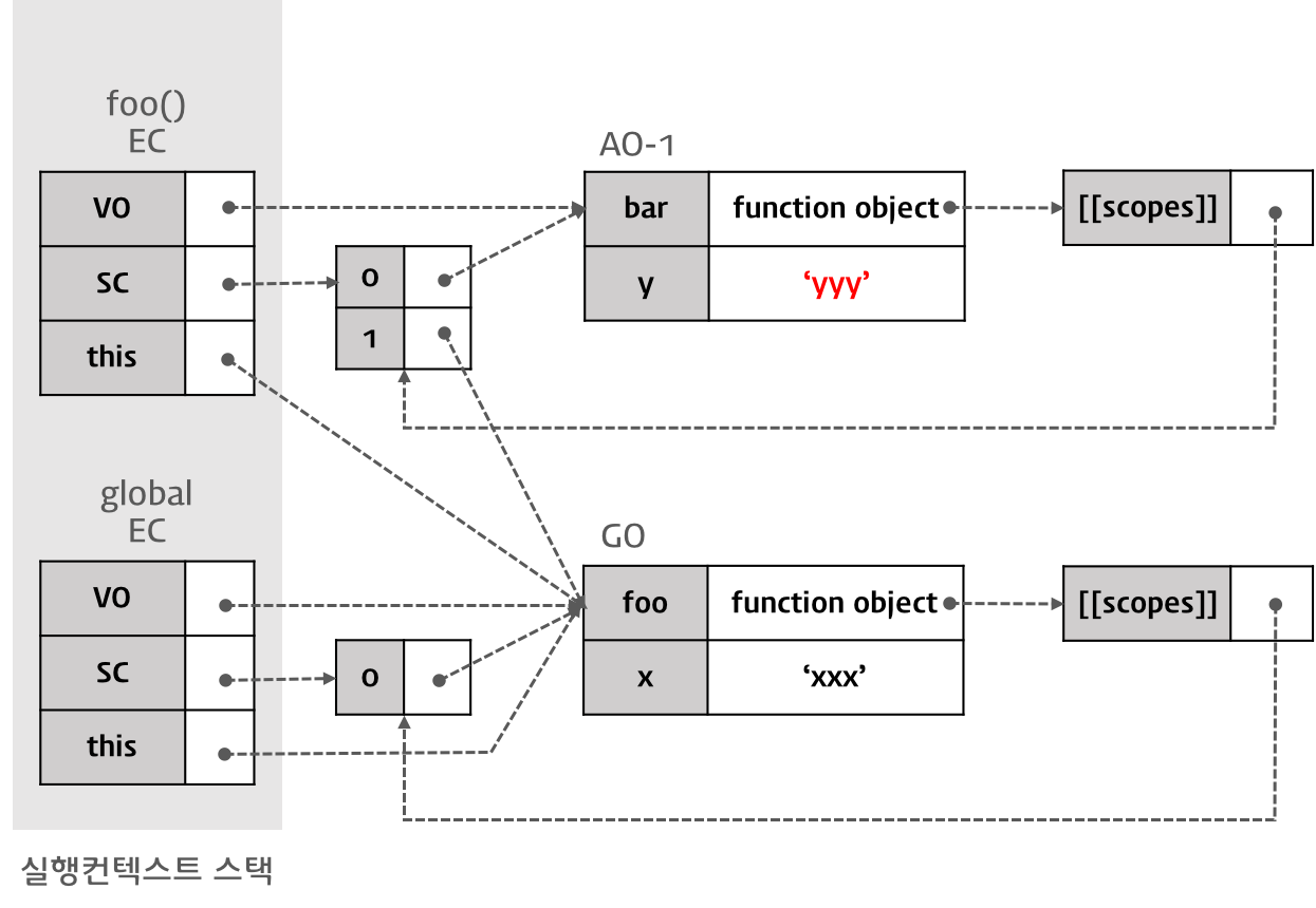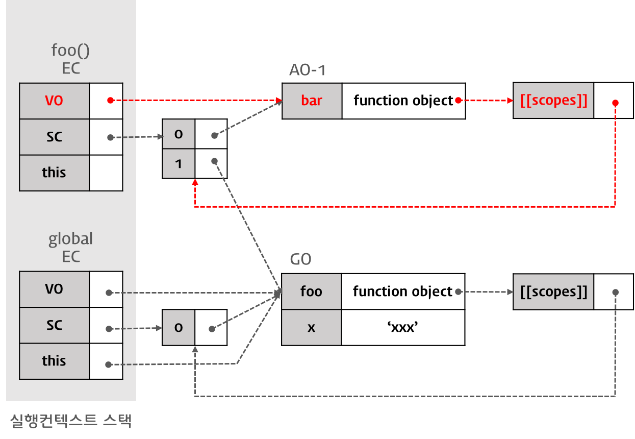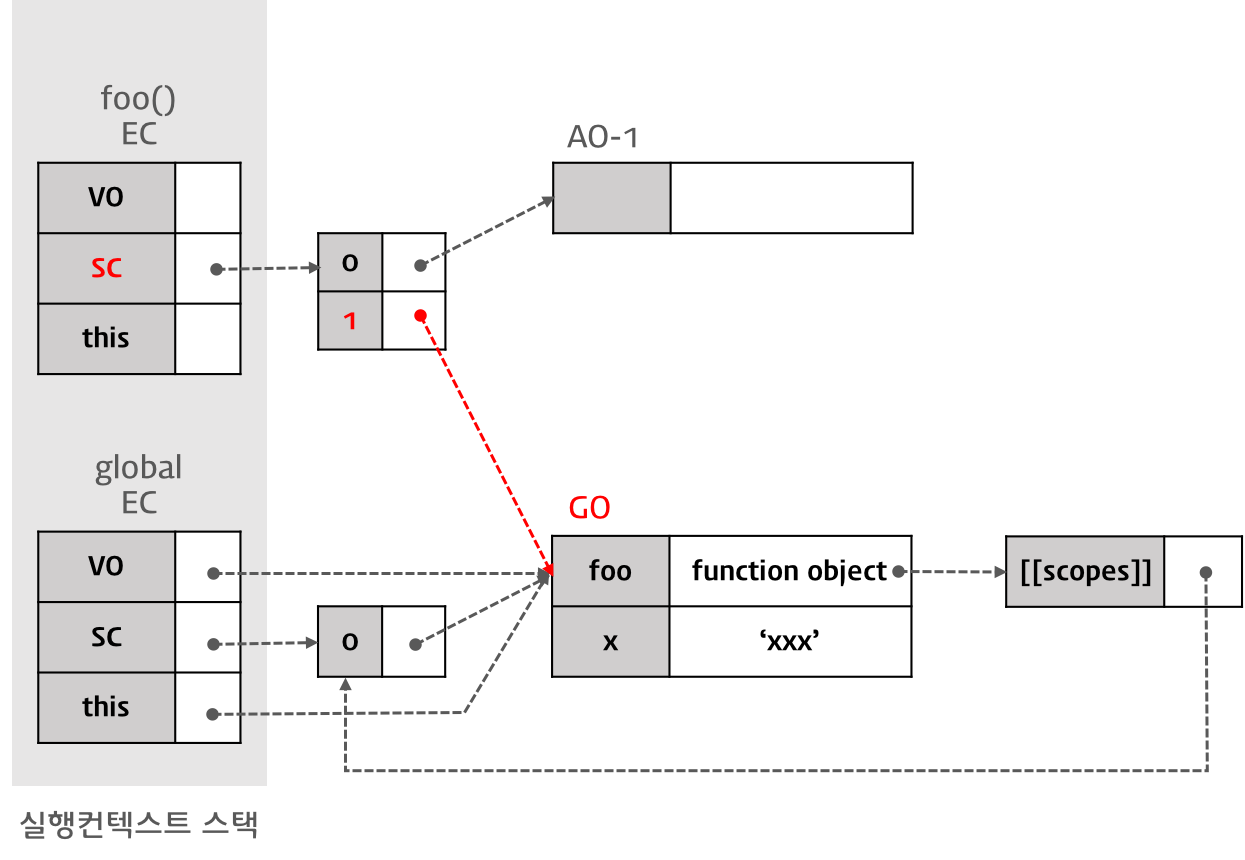 따라서, 이 경우 함수 foo를 실행한 직후 실행 컨텍스트의 스코프 체인은 Activation Object(함수 foo의 실행으로 만들어진 AO-1)과 전역 객체를 순차적으로 참조하게 된다.