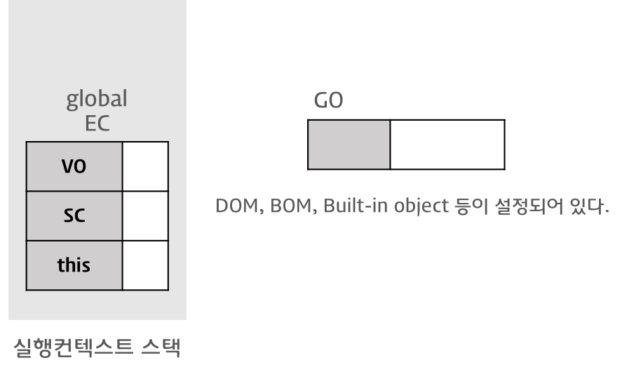Variable Object는 유일하며 최상위에 위치하고 모든 전역 변수, 전역 함수 등을 포함하는 전역 객체(Global Object / GO) 를 가리킨다.