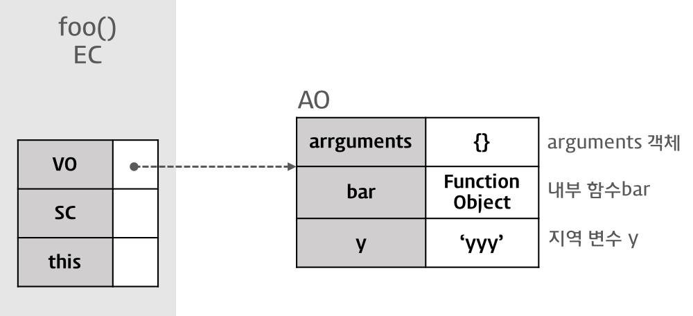 Variable Object는 Activation Object(AO / 활성 객체) 를 가리키며 매개변수와 인수들의 정보를 배열의 형태로 담고 있는 객체인 arguments object가 추가된다.