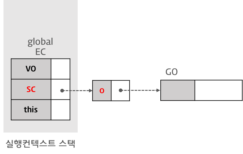 현재 실행 컨텍스트의 활성 객체(AO)를 선두로 하여 순차적으로 상위 컨텍스트의 활성 객체(AO)를 가리키며 마지막 리스트는 전역 객체(GO) 를 가리킨다.