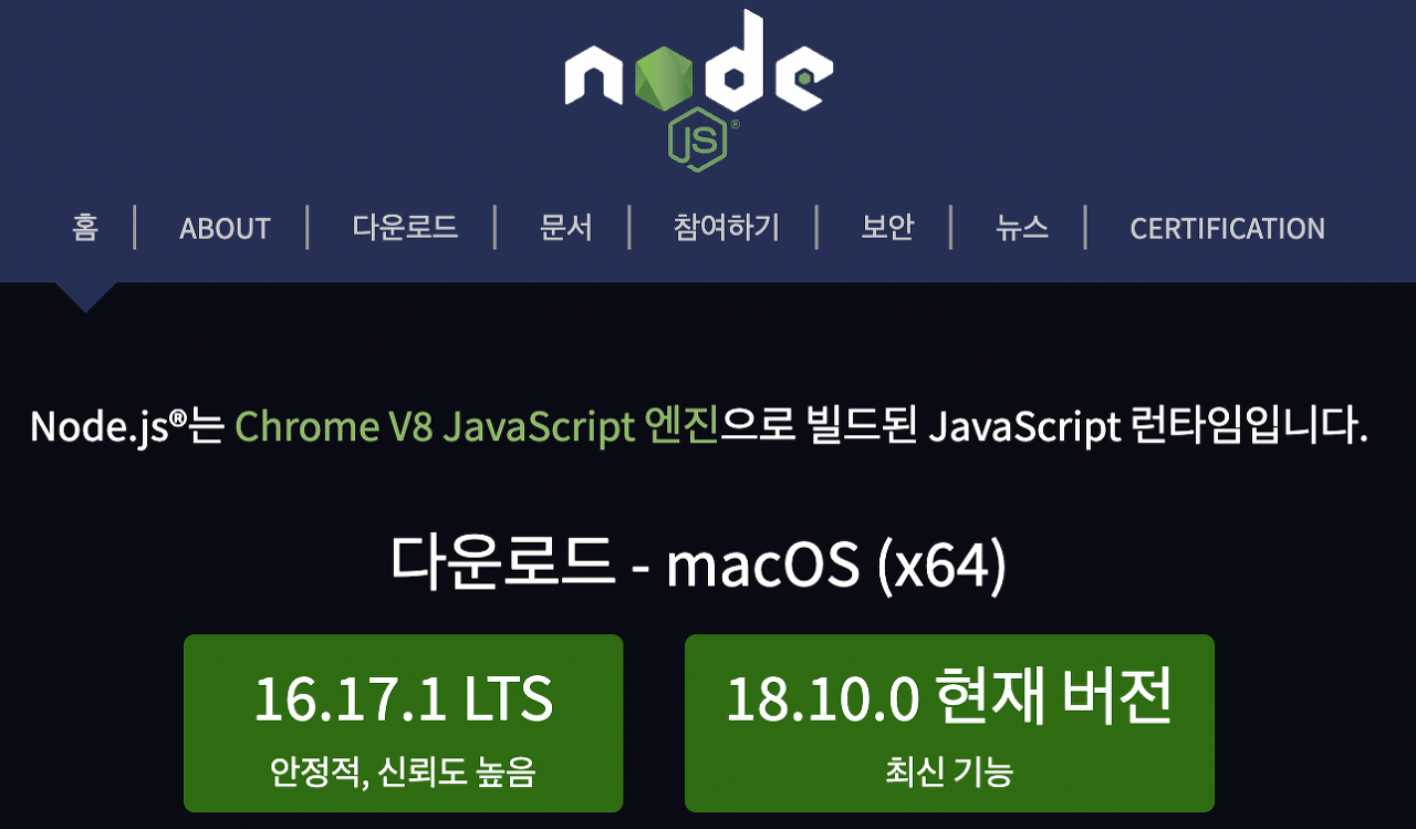 안정적인 왼쪽의 LTS버전을 설치한다. React설치를 위한 npm 은 node.js 설치 시 함께 설치된다.