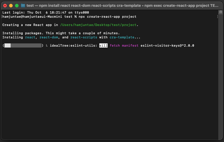 (mac 기준 오류 발생 시 sudo npx create-react-app 프로젝트명 입력 후 Enter를 치고 비밀번호를 입력하면 된다.)