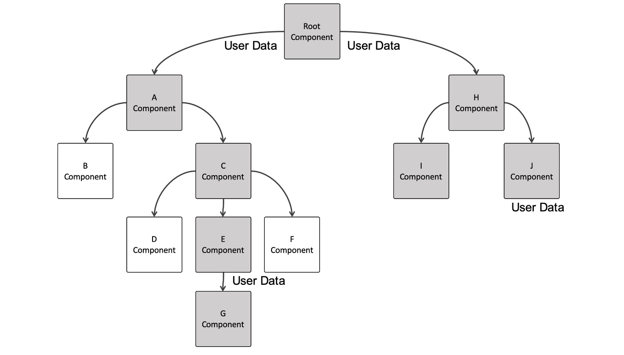 하지만 이처럼 컴포넌트 사이에 공유되는 데이터를 위해 매번 공통 부모 컴포넌트를 수정하고 하위 모든 컴포넌트에 데이터를 props로 전달하는 것은 매우 비효율적이다.