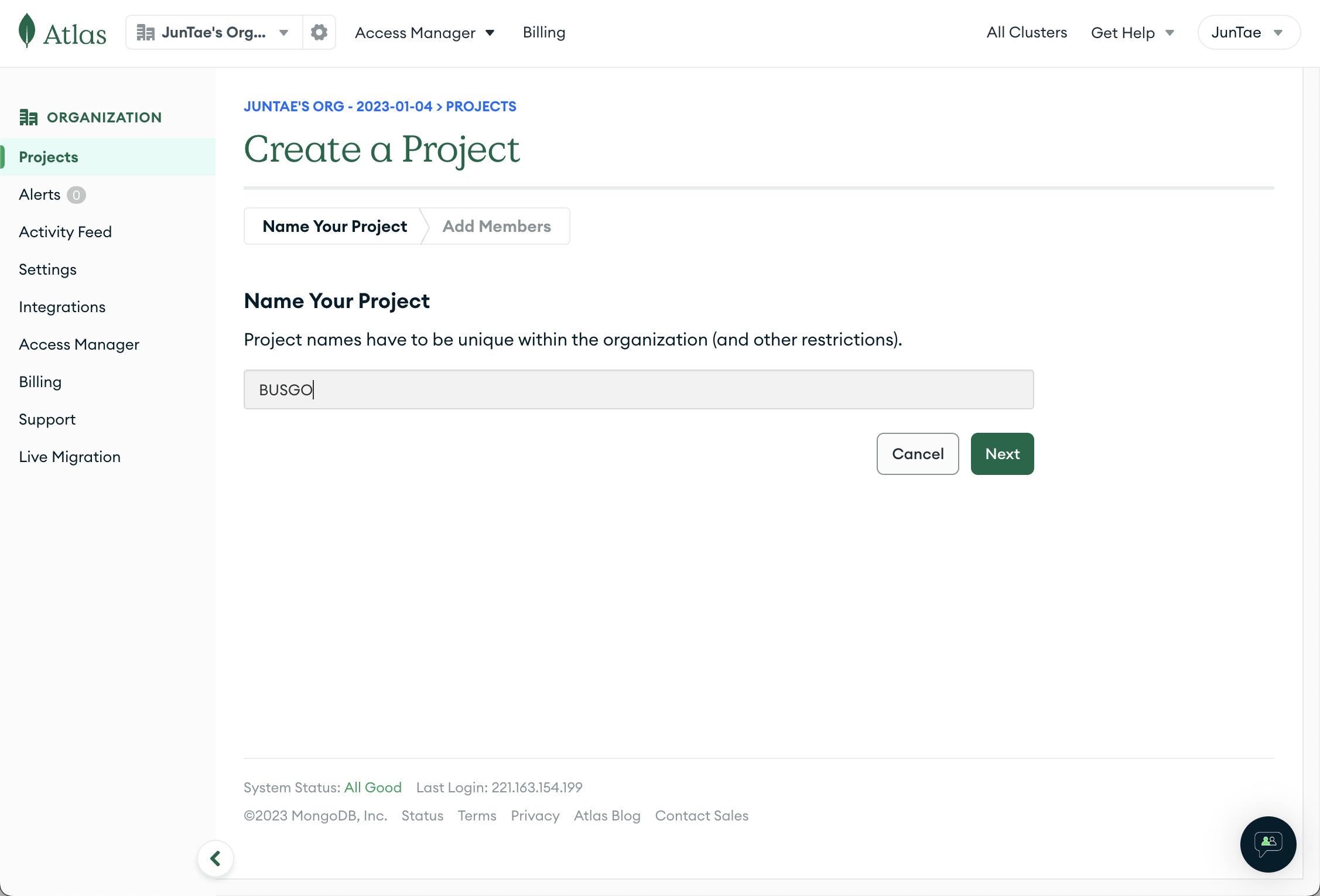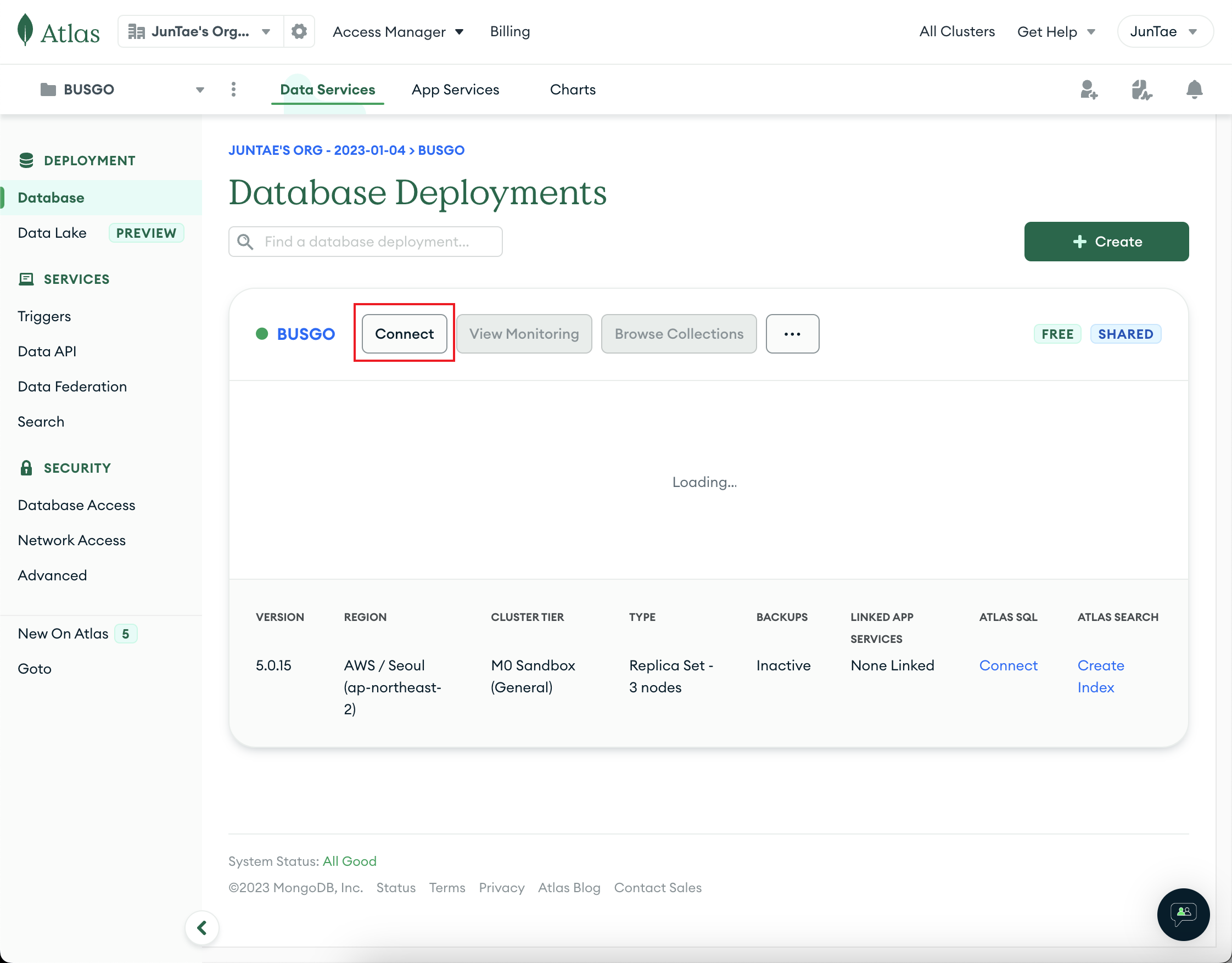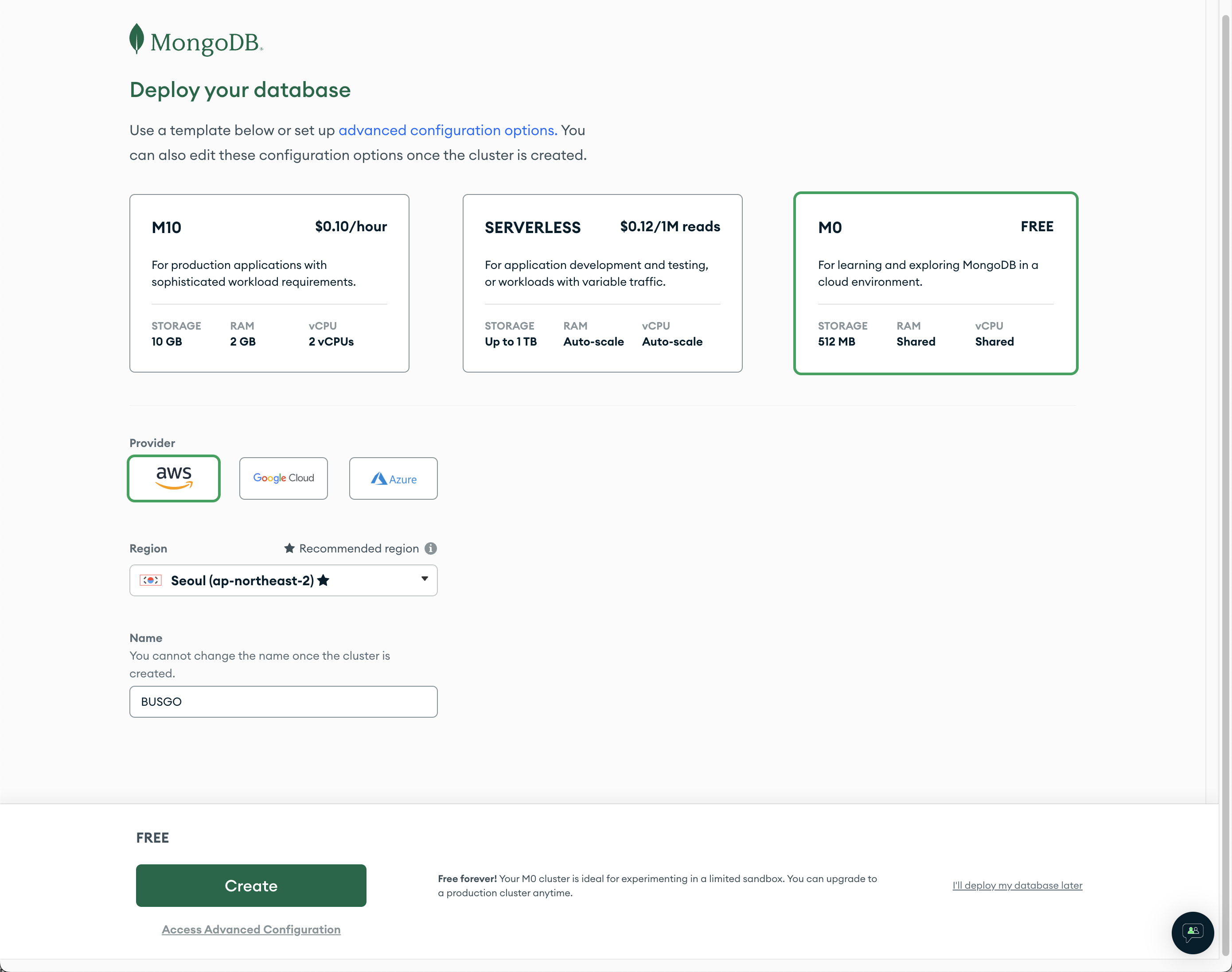 DB의 무료요금제(M0)선택 후 리전(Region)은 한국 선택 후 클러스터명을 작성 후 Create를 클릭