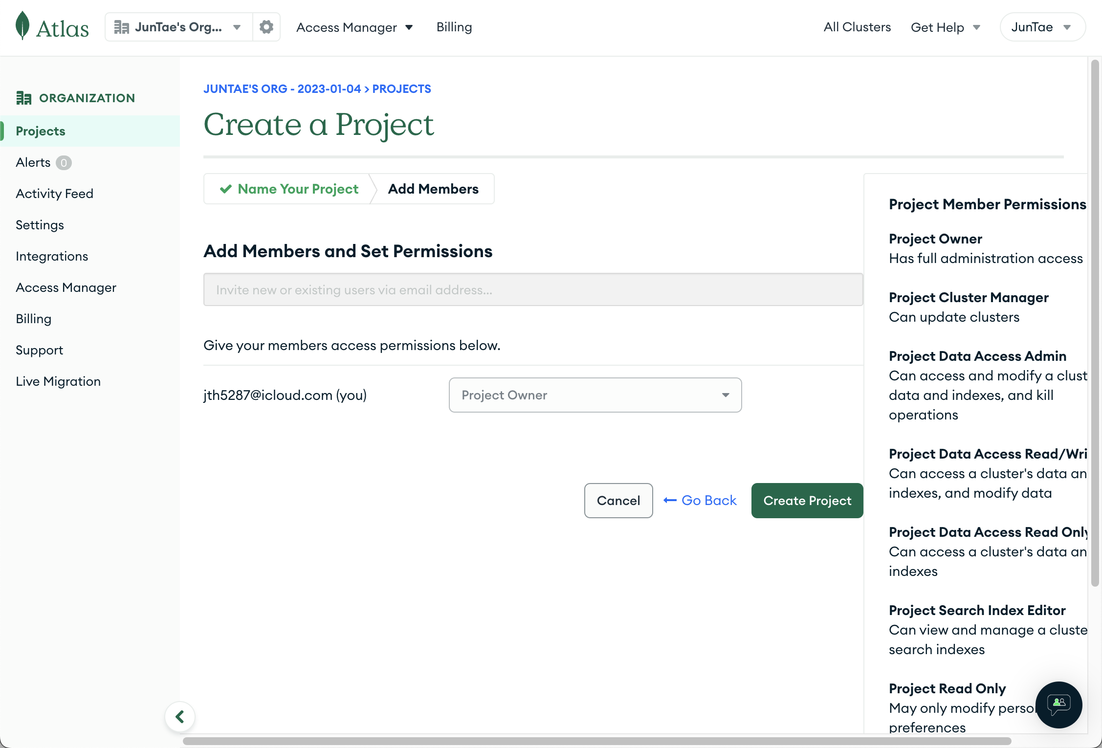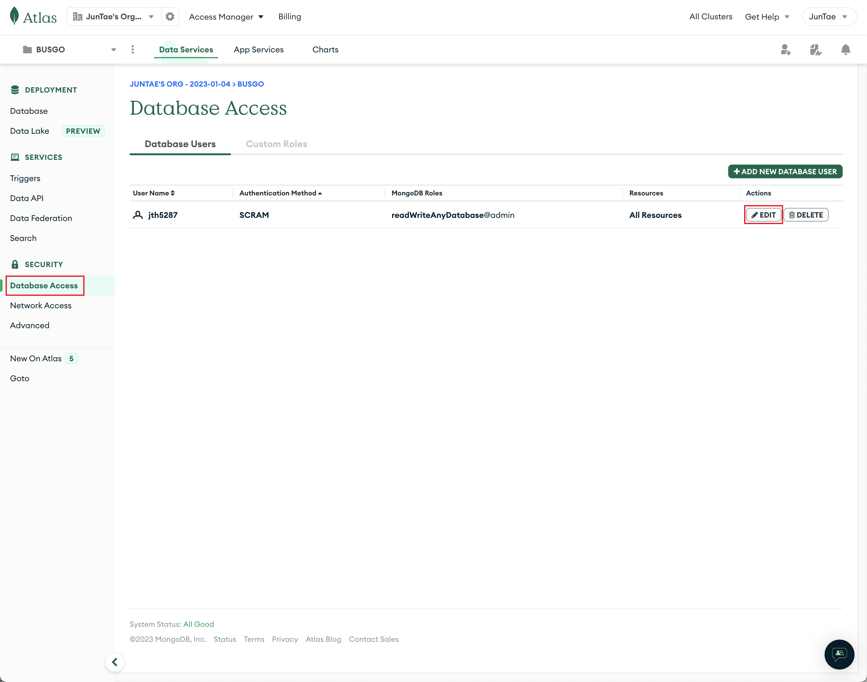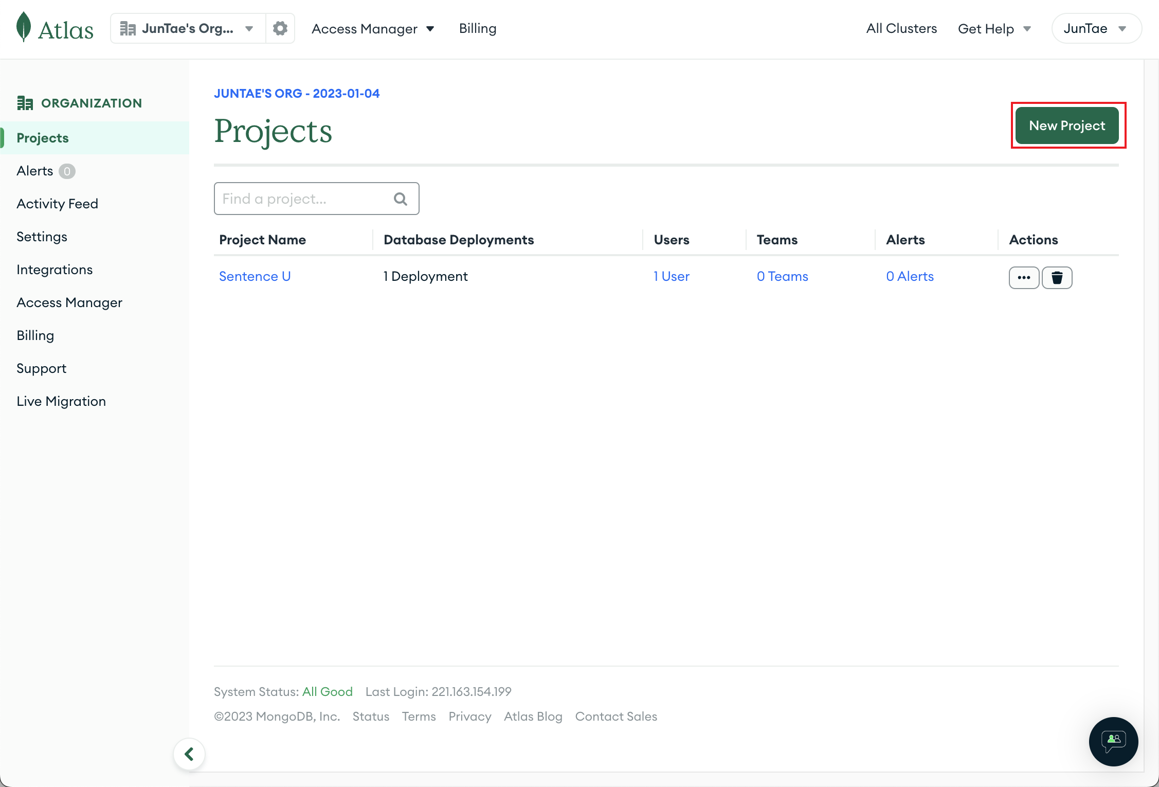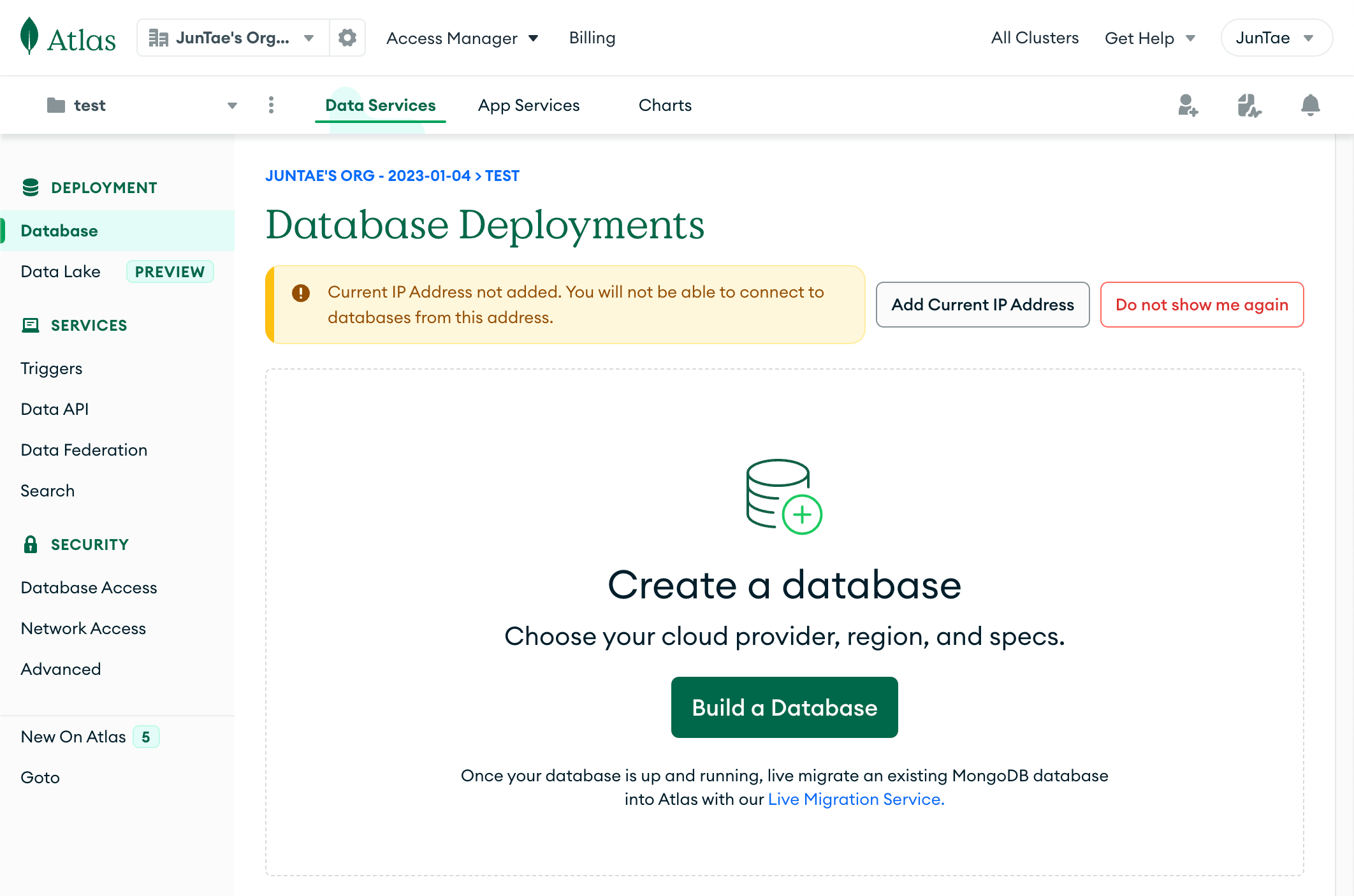 DB의 무료요금제(M0)선택 후 리전(Region)은 한국 선택 후 클러스터명을 작성 후 Create를 클릭