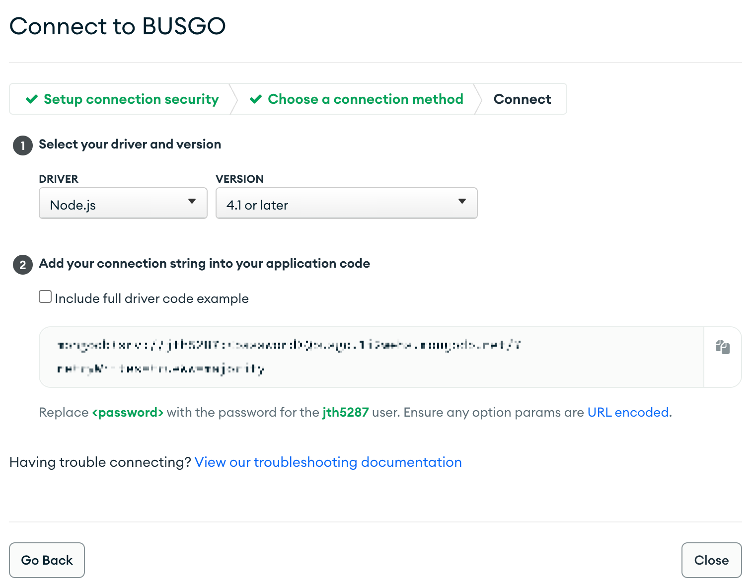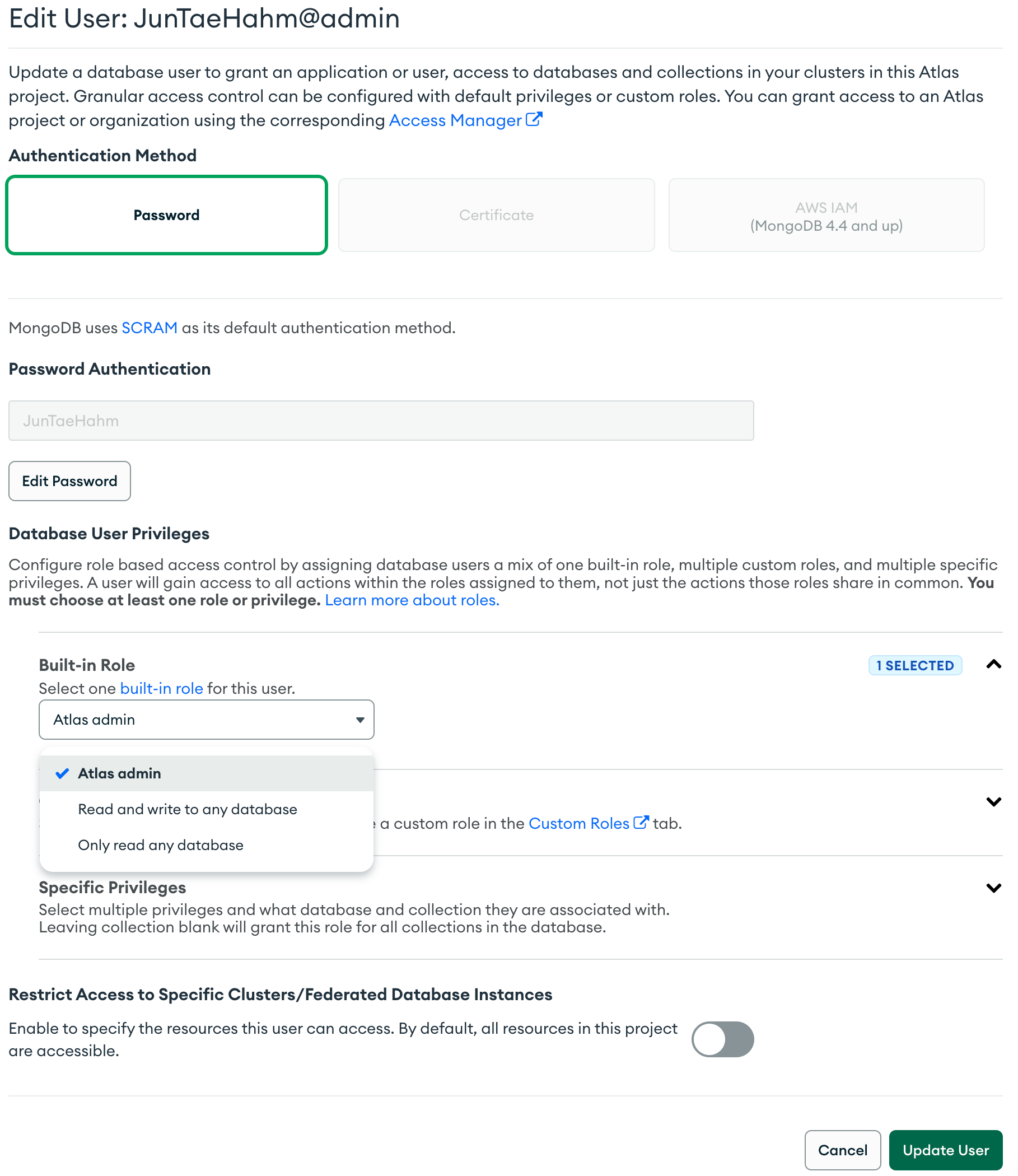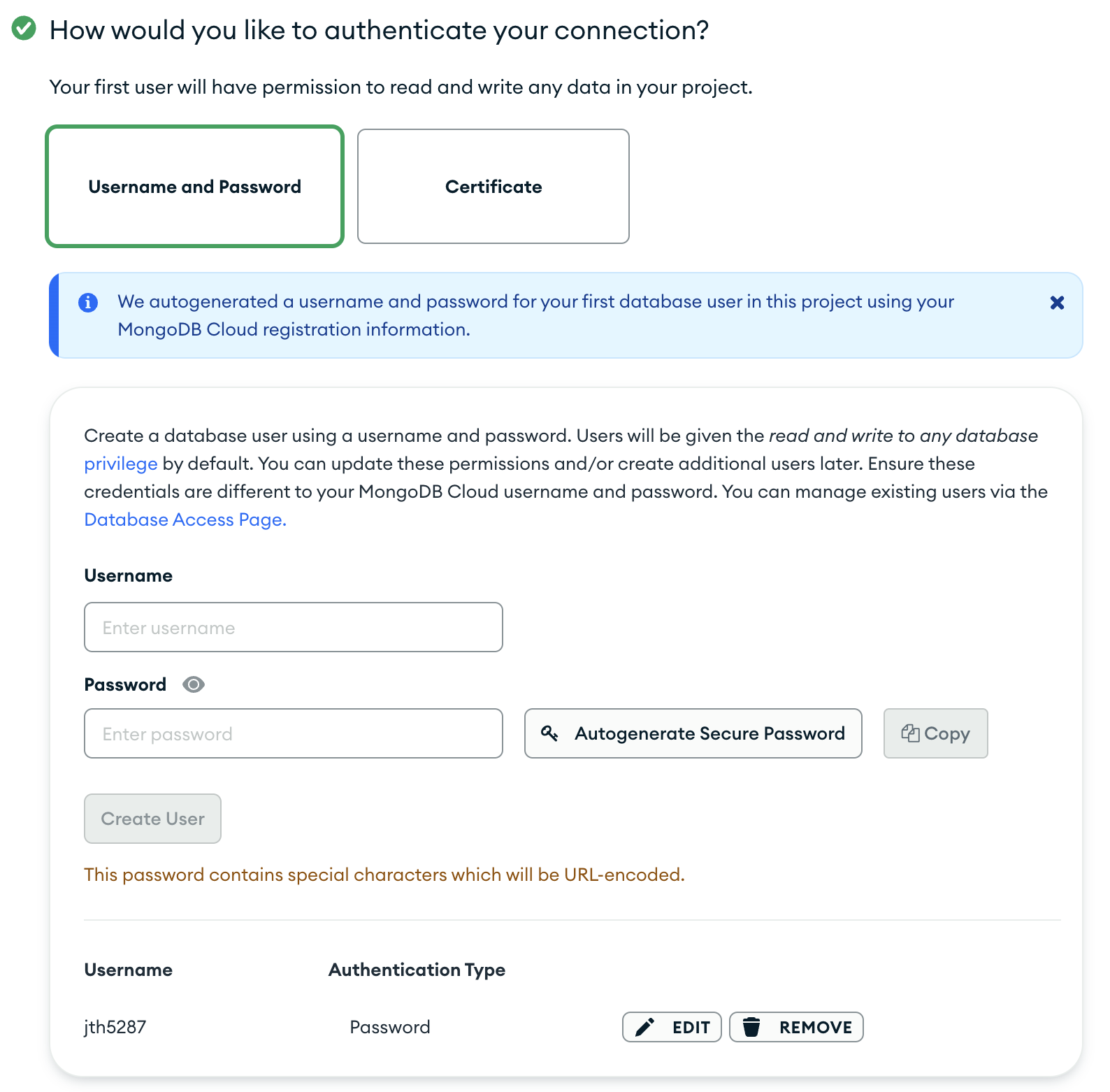 연결 및 인증에 사용할 유저명과 비밀번호 설정