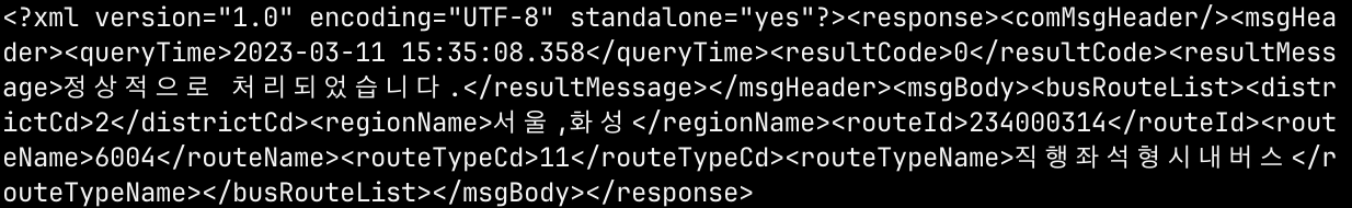 GET 호출을 통해 노선정보를 가져올 경우 아래와 같이 xml 형식의 데이터가 반환된다.