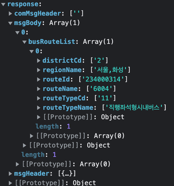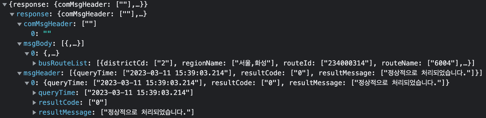 성공적으로 데이터를 받아오면 아래와 같이 버스 노선 정보에 대해 볼 수 있다.