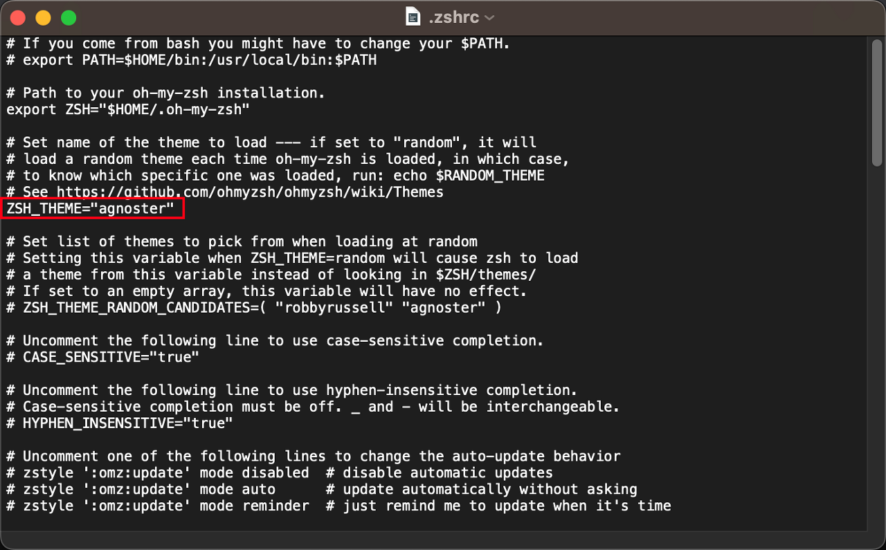 zshrc 파일을 열어 ZSH_THEME 부분을 수정하고 저장한다. 나는 agnoster를 선택했다.