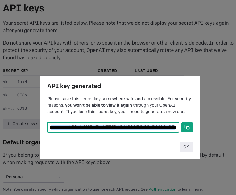 OPENAI API에서 로그인하고 설정에서 API Key 를 생성하자. secret key를 깃허브 리파지토리에 등록해야 하니 복사한다.