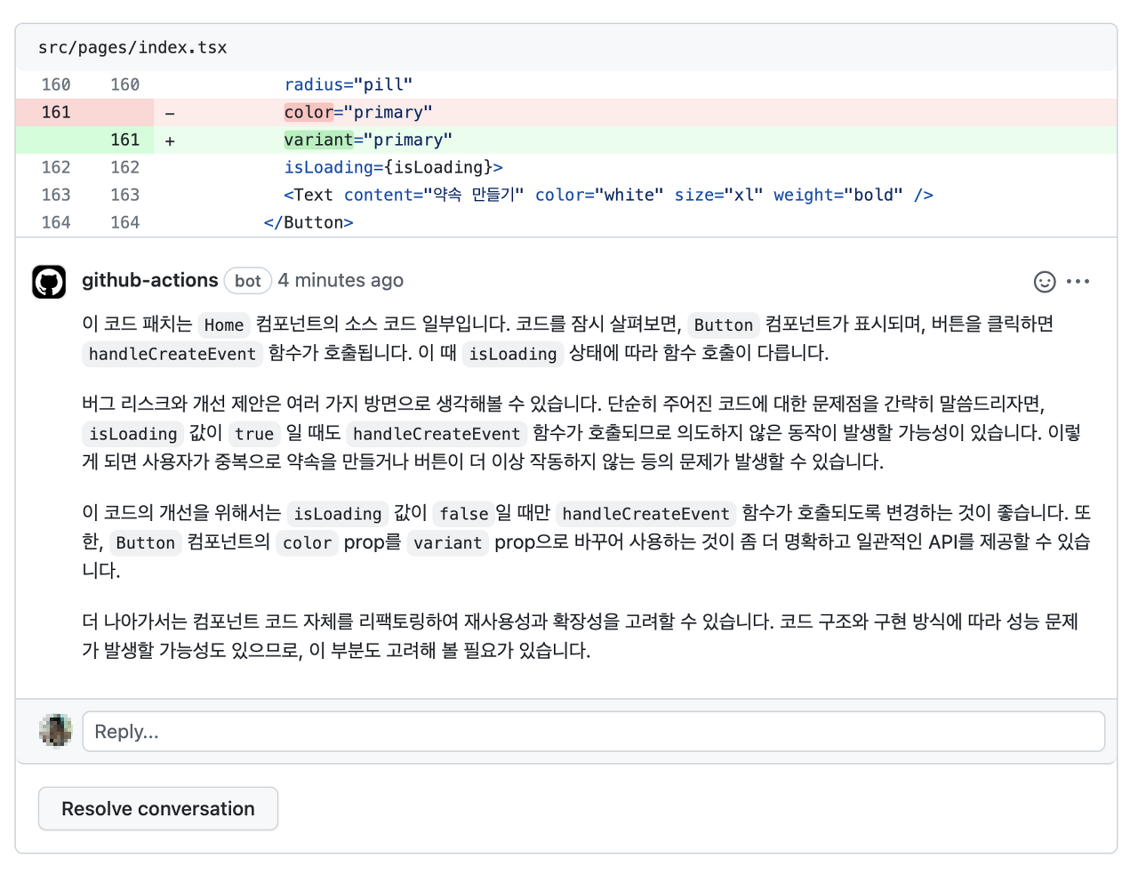 변경된 파일의 코드를 분석하고 버그와 개선 방향을 제시해준다. 하지만 리파지토리 전체를 보고 분석하는 것은 아니기 때문에 모듈들이 어떻게 사용될 수 있는지는 전혀 알지 못한다.