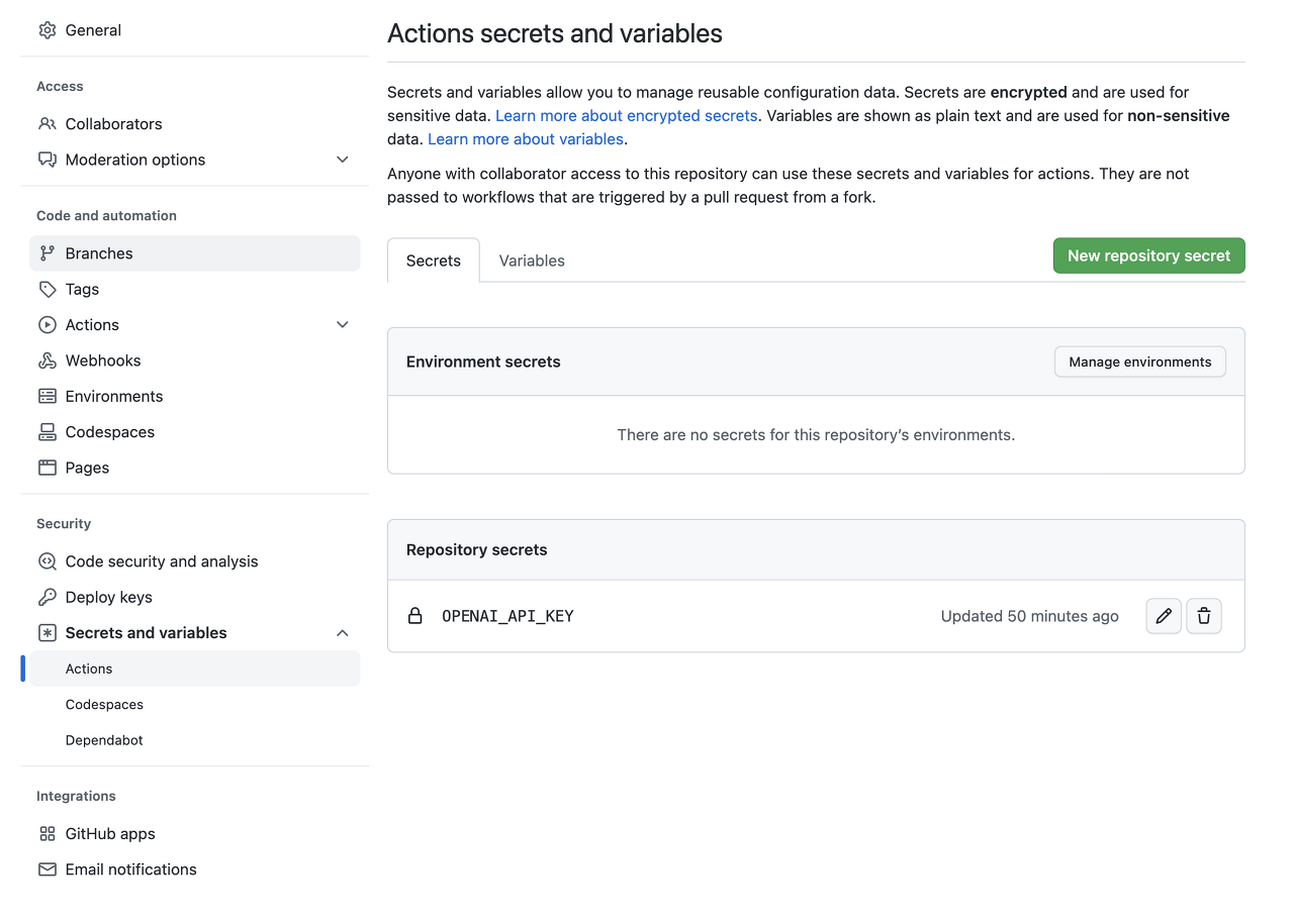 코드리뷰를 시킬 리파지토리나 조직의 설정에 들어가서 Secrets and variables를 선택한다. New repository secret 버튼을 클릭하여 이름을 OPENAI_API_KEY로 입력하고 secret에 복사해둔 API Key를 붙여넣는다.
