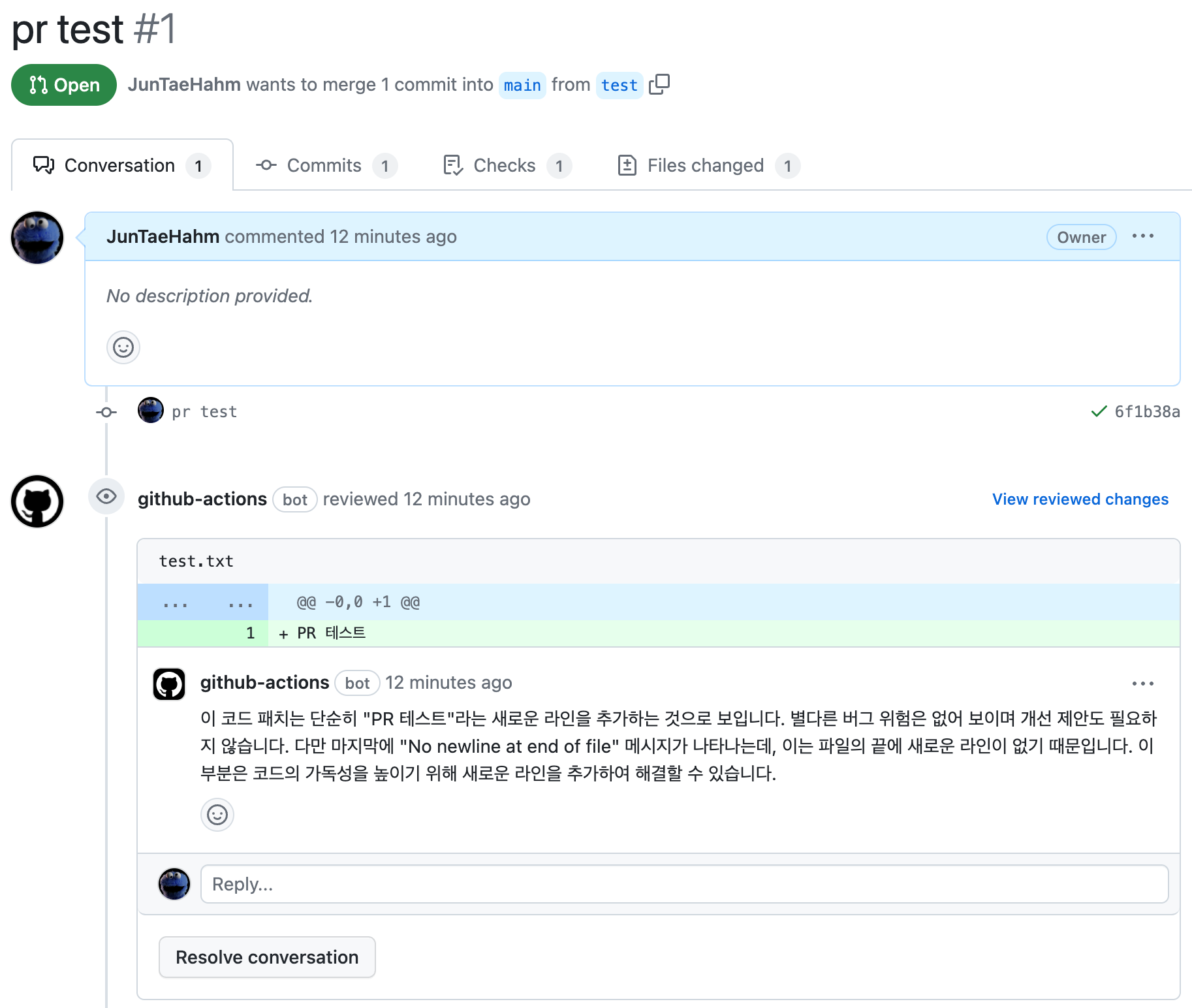 테스트 브랜치를 생성하고 PR을 올려보자.