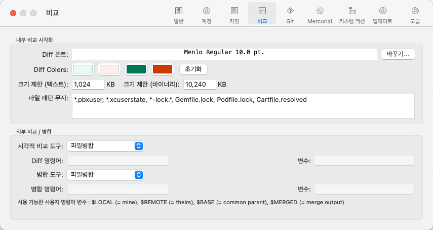 비교 탭으로 들어가면 외부 비교/병합 - 시각적 비교 도구가 파일병합으로 되어있을 것이다.