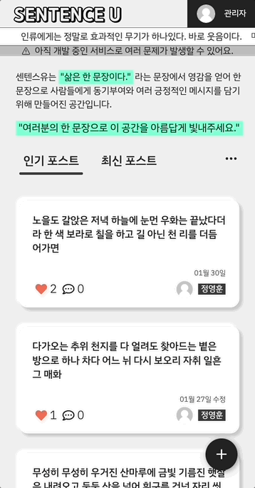 기존 모바일크기 홈페이지는 인기포스트와 최근포스트가 일렬로 배치되었고, 최근 포스트를 보기 위해서는 꽤나 많은 스크롤이 필요했다.
