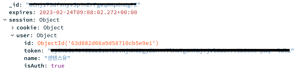 로그인에 성공 하면 MongoDB에 sessions 컬렉션에 세션이 저장된 모습을 볼 수 있다. 로그아웃하면 삭제된다.