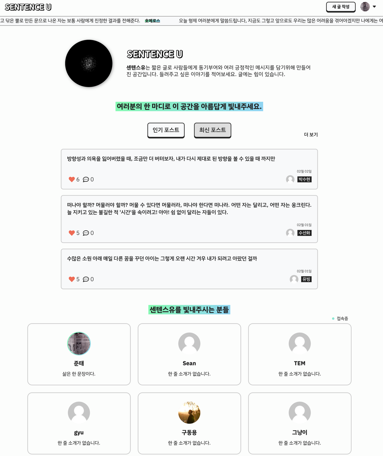센텐스유는 짧은 글로 사람들에게 동기부여와 여러 긍정적인 메시지를 담기위해 만들어진 공간입니다.