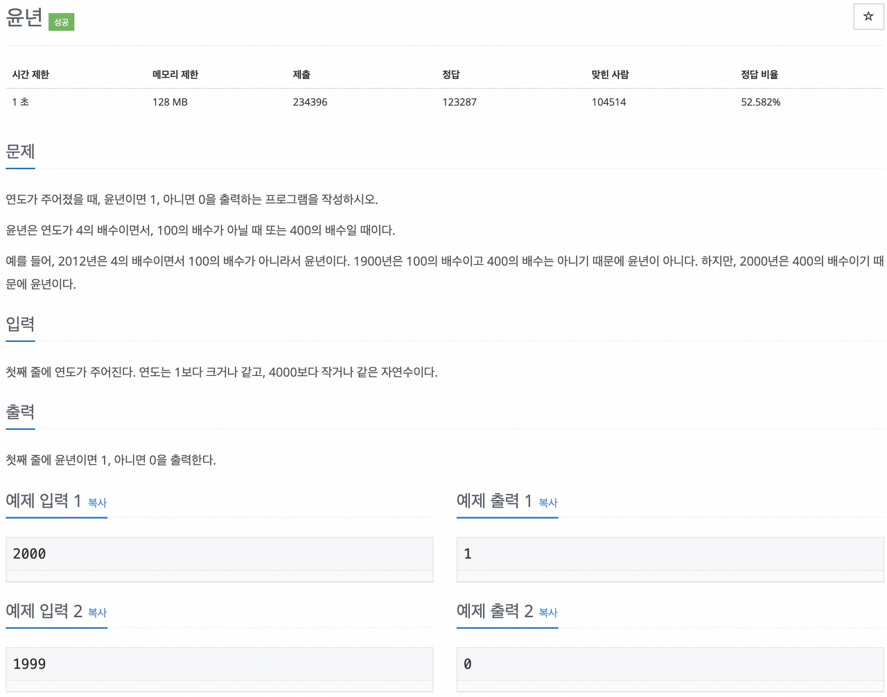 윤년일 경우 1을, 윤년이 아닐 경우 0을 출력하는 문제였다.